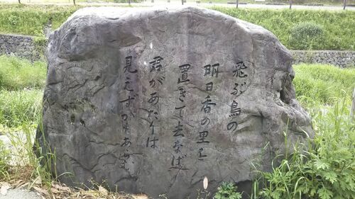 奈良県高市郡明日香村には、万葉の歌碑がいくつも設けられています。これは飛鳥川雷橋そばの歌碑。「飛ぶ鳥の明日香の里を置きて去なば君があたりは見えずかもあらむ」。持統天皇の歌だそうです。(T)=2020年5月25日撮影