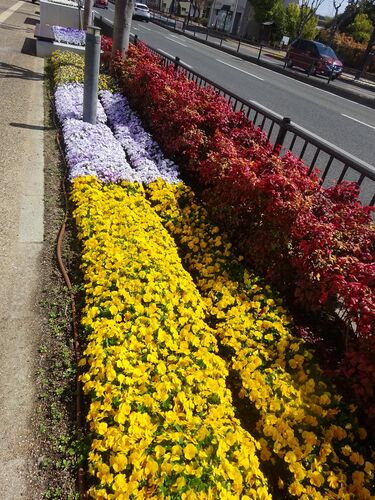 奈良市の中心部を東西に走る幹線道路、大宮通りは歩道に花壇が並んでいて、花の道になっています。(S)=2023年3月20日撮影