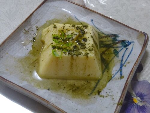 市販の玉子豆腐を皿に乗せ、つゆもかけます。上から粉茶をいふればできあがり。(S)=2024年6月29日撮影