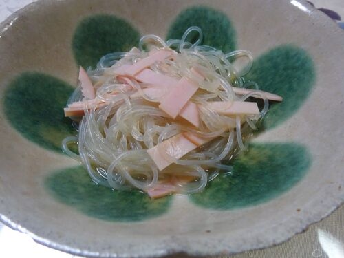 ハモのゆで汁を使います。おろしショウガと白だしを加え、はるさめをゆでます。最後に短冊に切ったハムを加えます。はるさめがゆで汁を吸ったら皿に盛ってできあがり、(S)=2024年18月12日撮影
