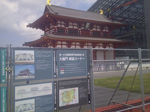 奈良市・平城宮跡で、大極殿院南門・東楼の復原工事が進んでいて、現場には解説コーナーが設けてあります。(S)=2025年9月9日撮影