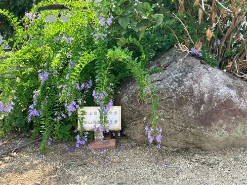 奈良県大和高田市、近鉄大阪線駅築山駅の前に、小さな石の庭があります。築山自治会、長生会の立て札があり、小さいながら整備されていて、行った時はルリマツリの花も咲いていました。(S)=2025年9月16日撮影
