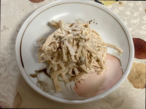 切り干しダイコン水で戻し、サッとゆでて水分を取ります。マヨネーズに肉みそを加えてよく混ぜ、切り干しダイコンに和えればできあがり。(S)=2025年10月27日撮影