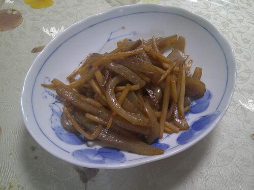 タケノコはゆでて細く切ったパック入りを買ってきます。コンニャクを細長く切ります。フライパンにサラダ油とゴマ油をひき、2つの具材を炒めます。味つけは砂糖、酒、しょうゆ。水分がなくなるまで炒めれば できあがり。(S)=2025年10月3日撮影