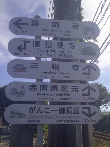 奈良市、近鉄橿原線西ノ京駅そばの目についた看板を集めました。(S)=2025年10月8日撮影