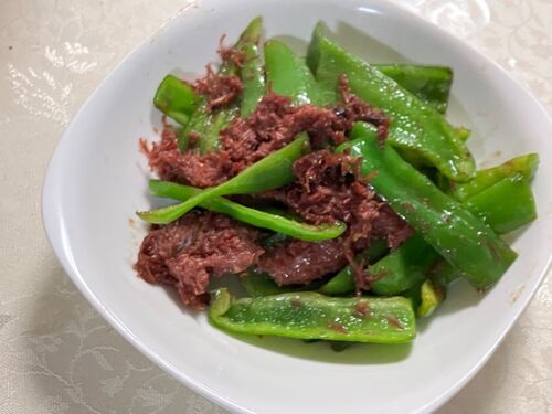 ピーマンはへたと種を取り、たてにきります。コンビーフはカットします。フライパンに油をひき、2つの具材にだしの素をふって炒めます。最後にニンニクしょうゆで味をつければできあがり。(S)=2025年10月28日撮影