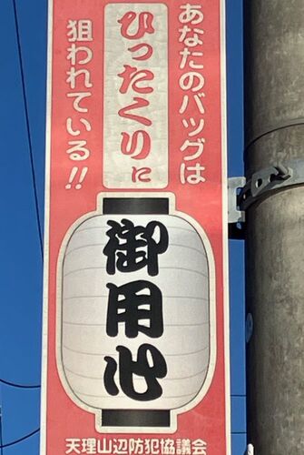 奈良県天理市、近鉄天理線二階堂駅周辺の目についた看板です。(S)=2025年10月9日撮影