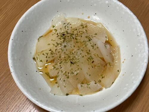 トウガンは皮をむき、薄めに切ります。鍋にだしを取り、白だしを加えて軽く煮ます。水分を切ってボウルに入れ、ポン酢で混ぜます。皿に盛り、青ノリの粉をふればできあがり。(S)=2026年1月20日撮影